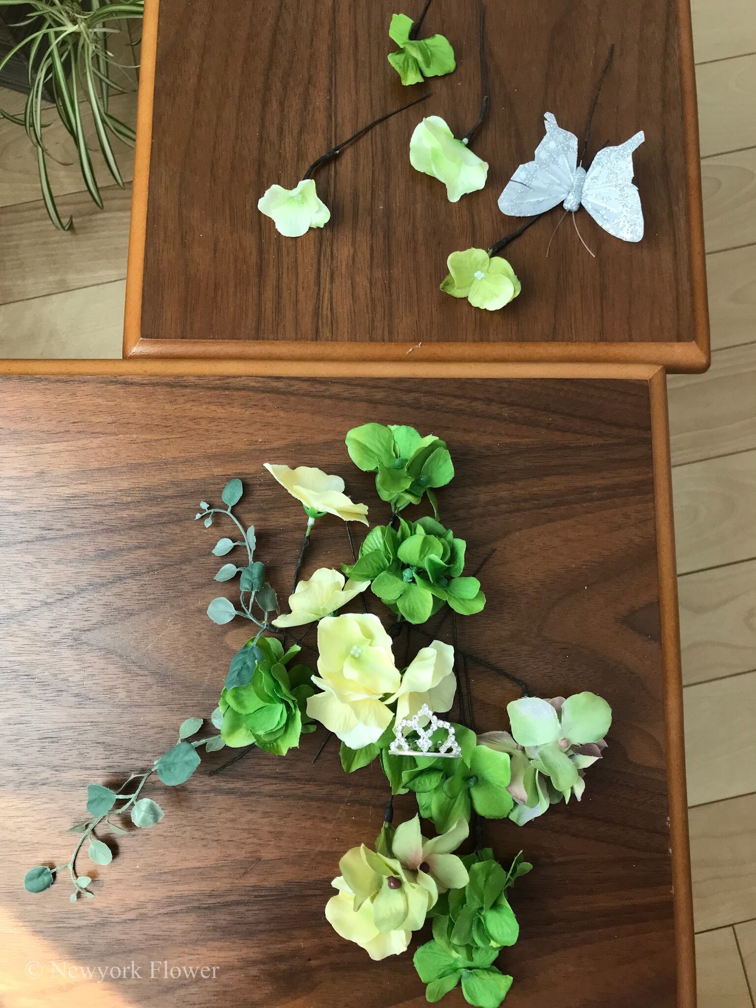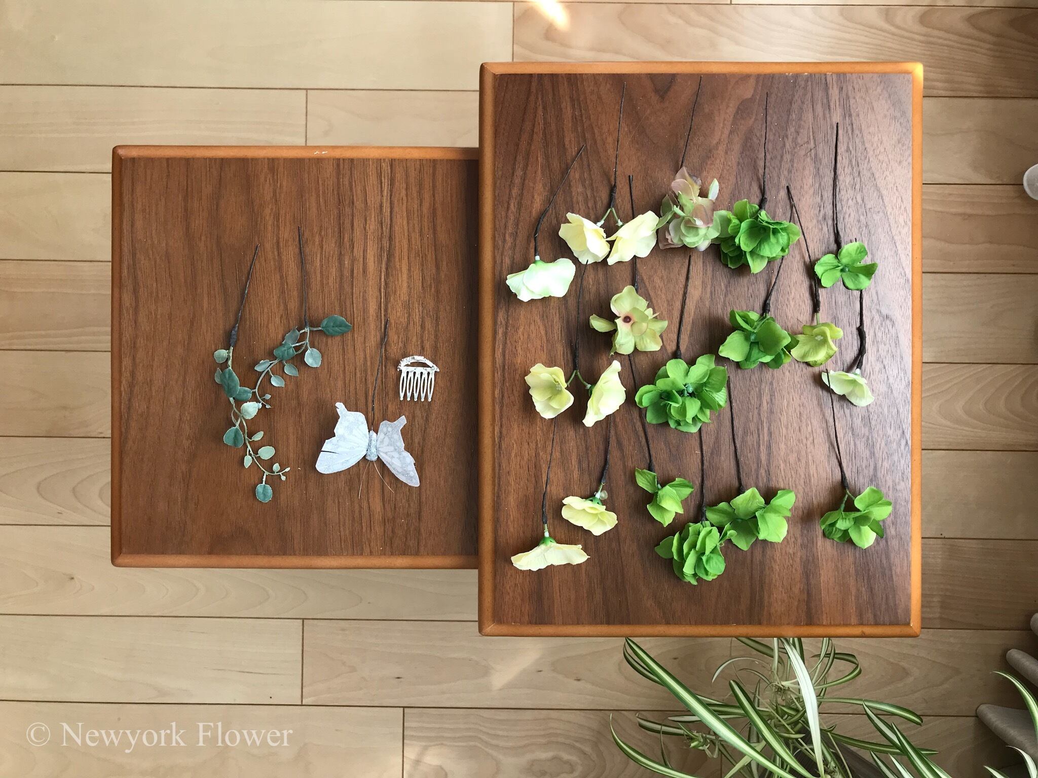 生花では表現できない、軽やかさとお色の組み合わせで、色々なヘアスタイルにお使いいただけるヘッド飾りです。