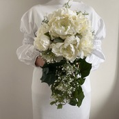 使用花材:ホワイト ピオニー(芍薬)9厘・プリマジプソ(ピュアホワイト)・ヘデラリーフ