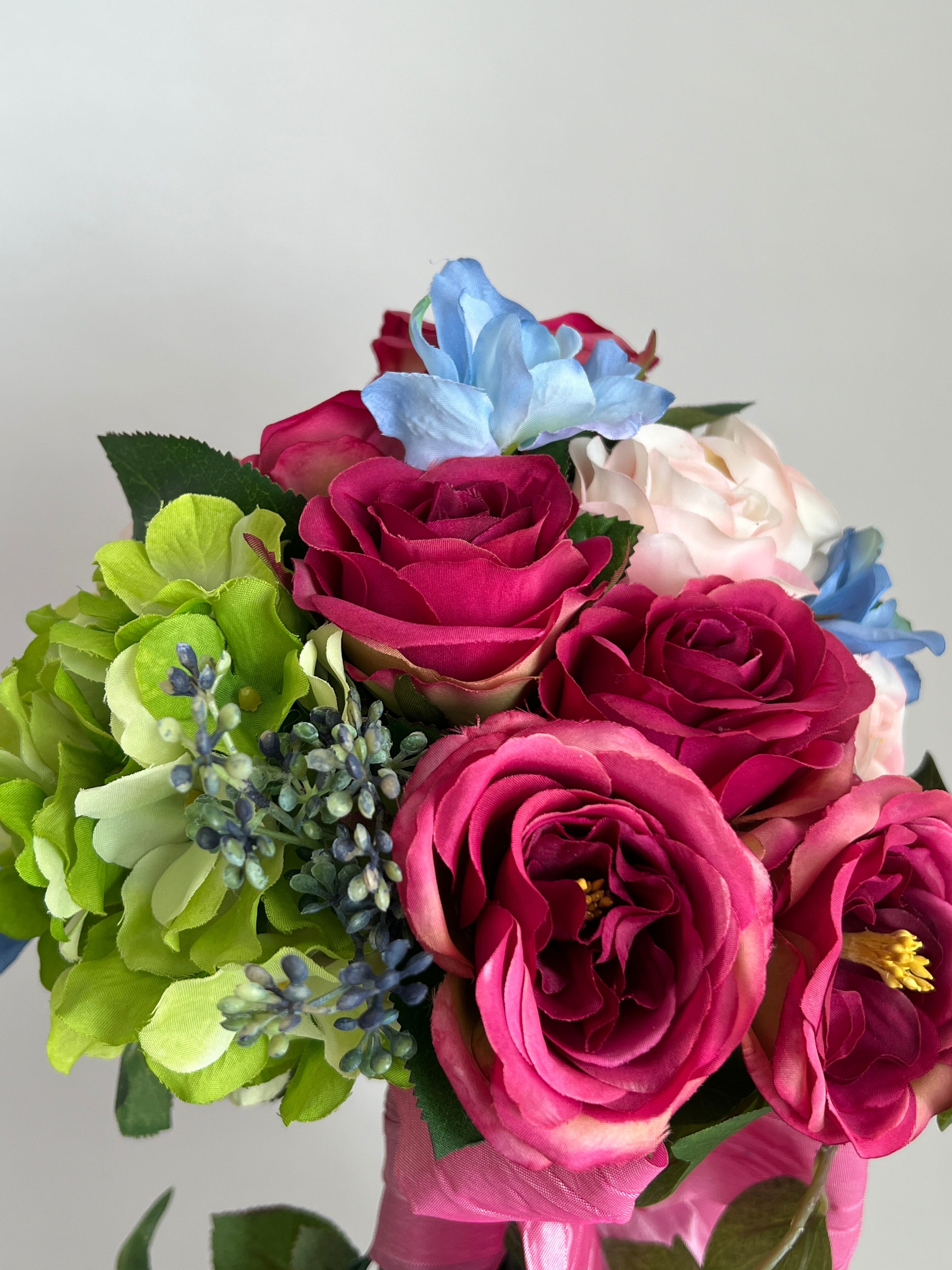 ピンク系グラデーションのバラの美しい存在感に水色のデルフェニウムが可愛らしさを添える、ミディアムサイズのブーケドマリエ。