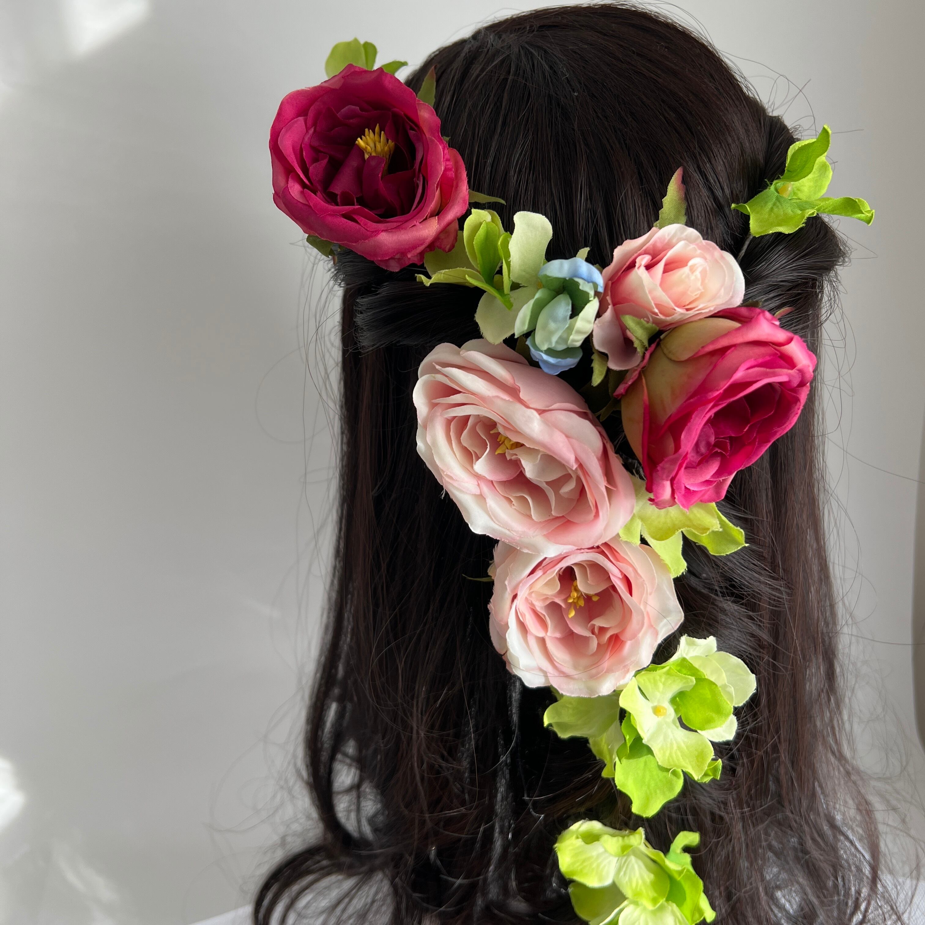 生花では表現できない、軽やかさとお色の組み合わせで、色々なヘアスタイルにお使いいただけるヘッド飾りです。
