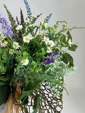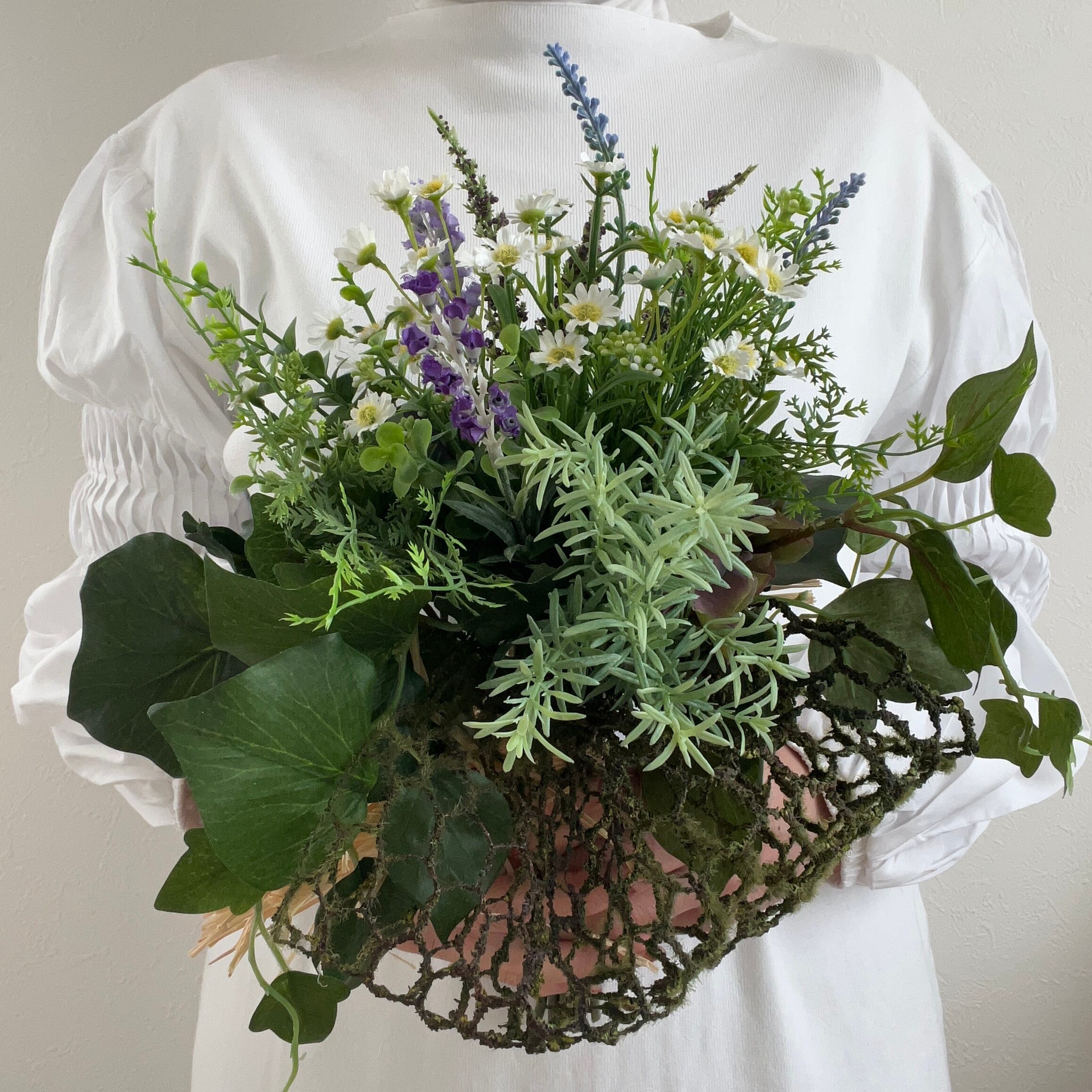 使用花材: カモミール・ラベンダー・ローズマリー・ハイドレンジア・ヘデラリーフ・苔ネットリボン