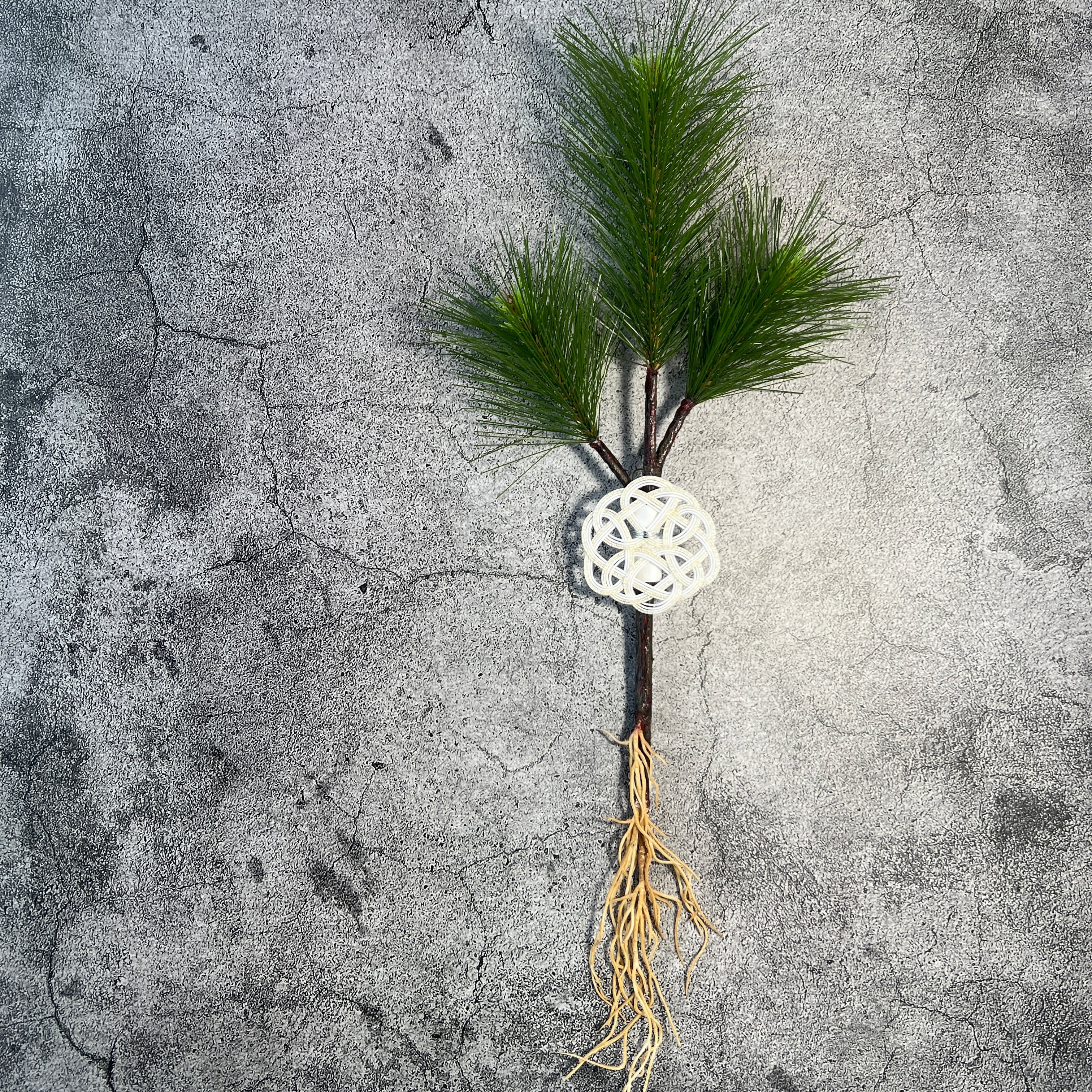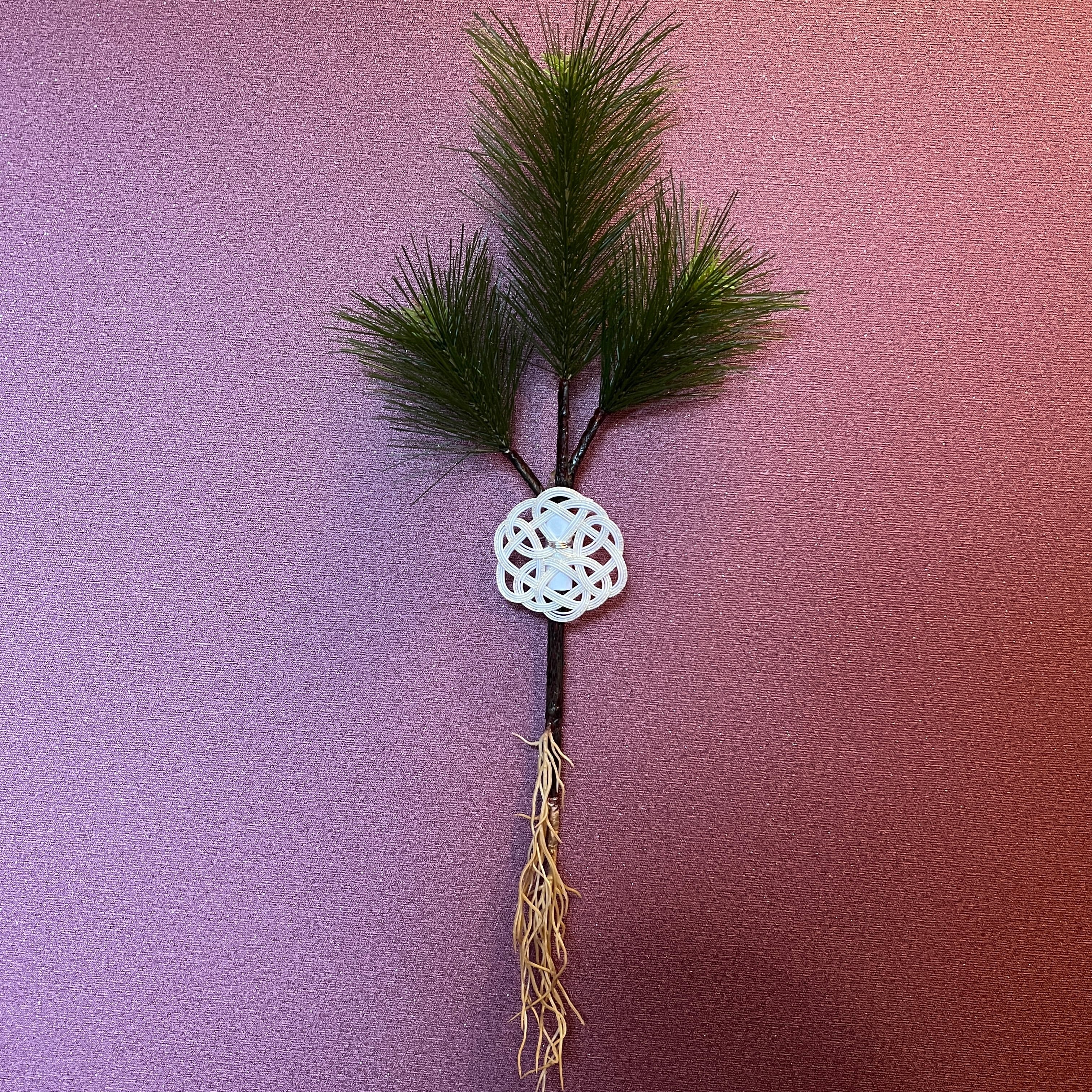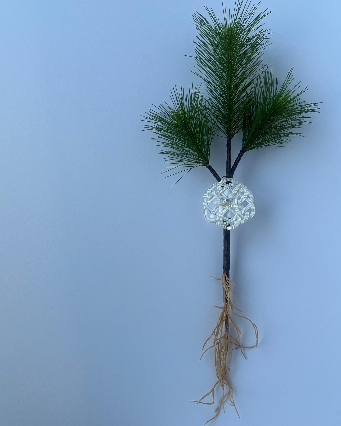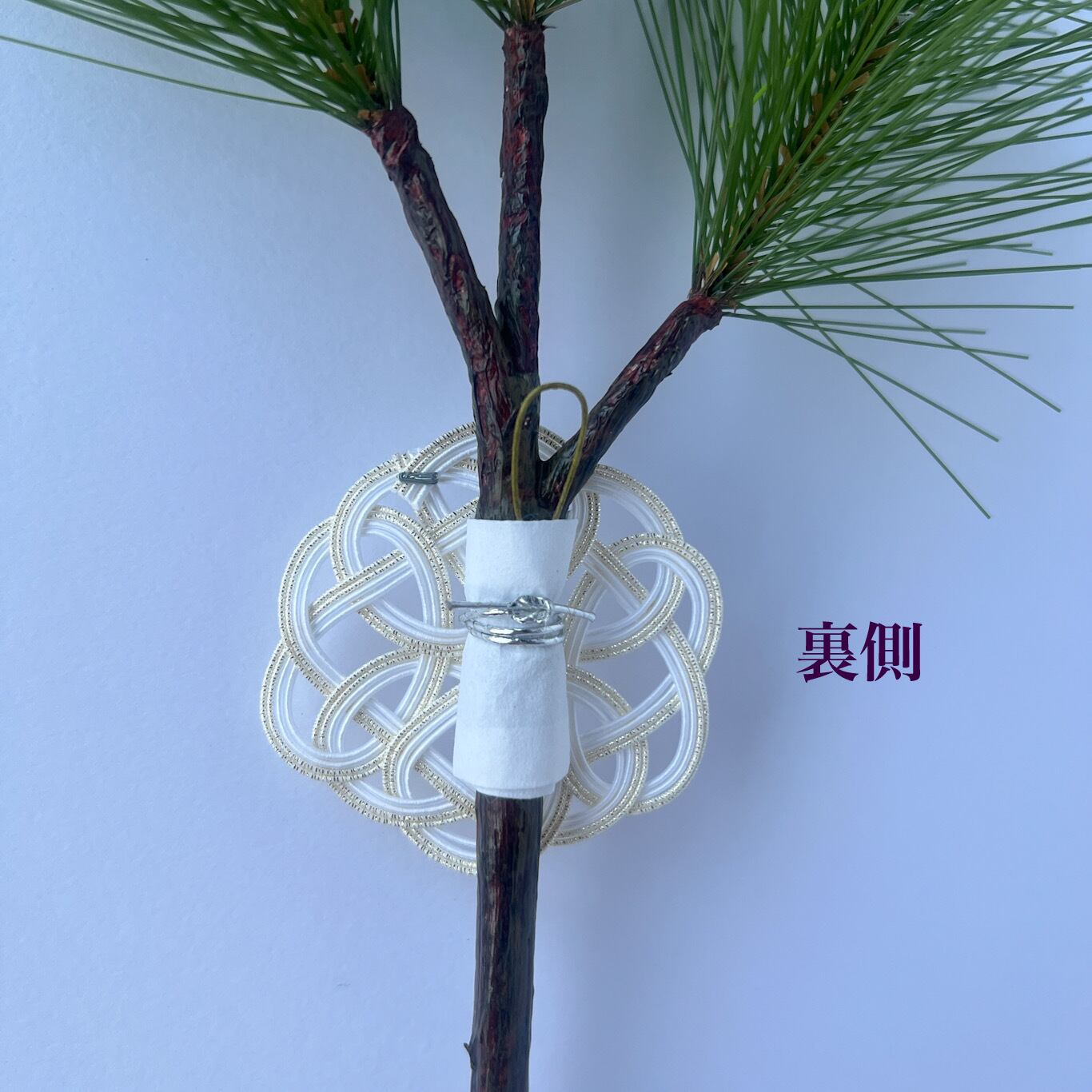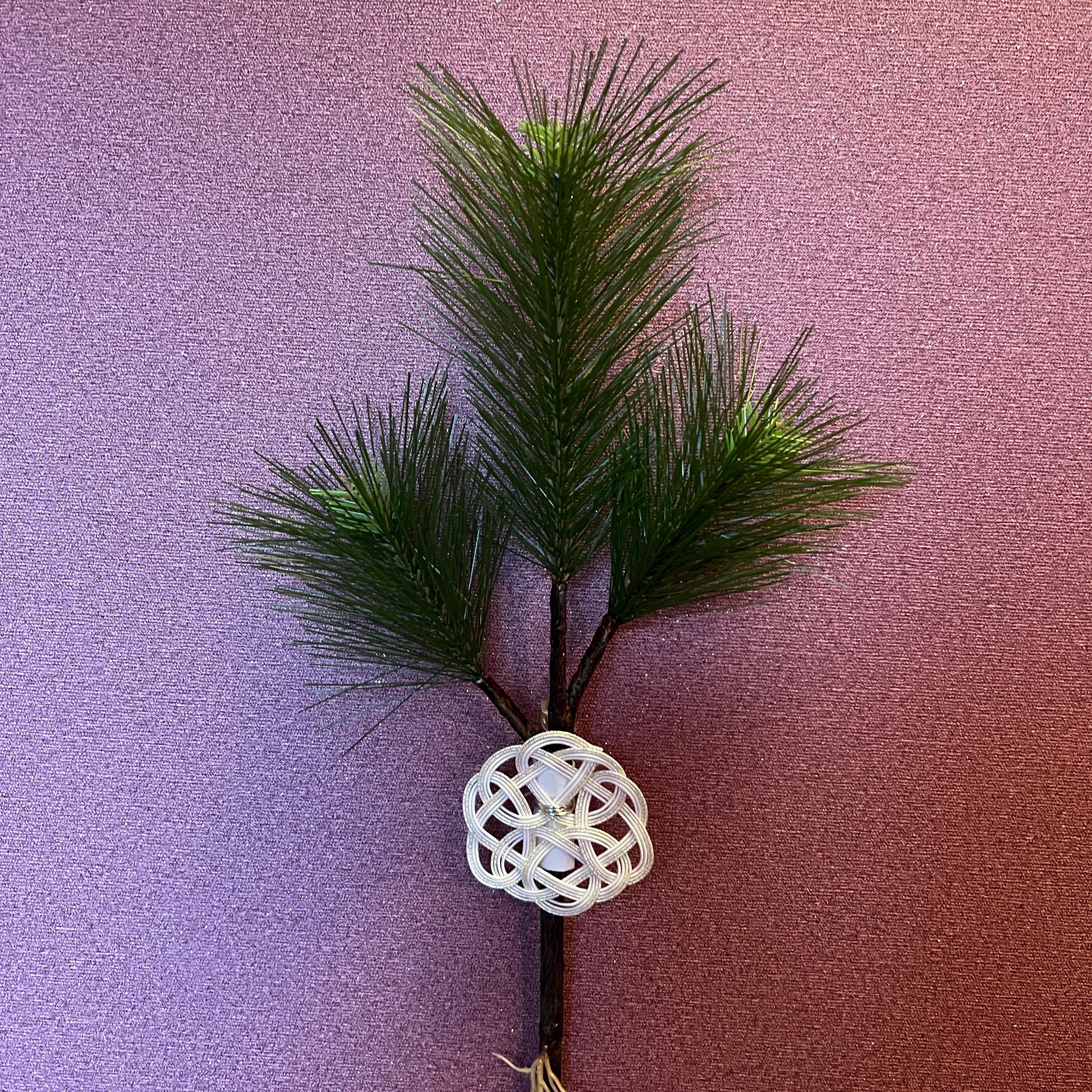 枝の中程に和紙を巻き、梅結びの白金の水引で彩ります。